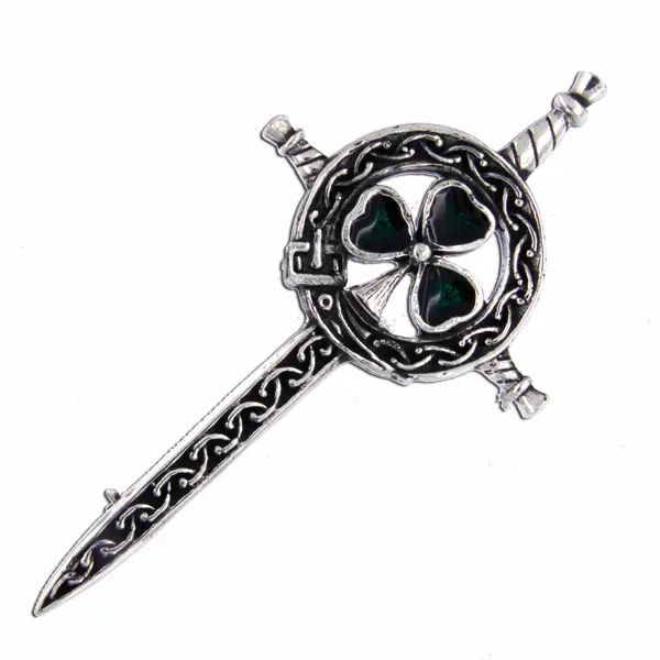 Shamrock sword brooch in pewter. An intricate Celtic knotwork design on the blade and circular motif portray the detail in this item.
